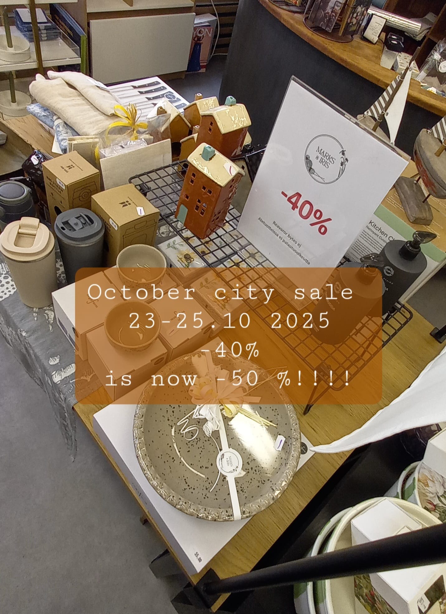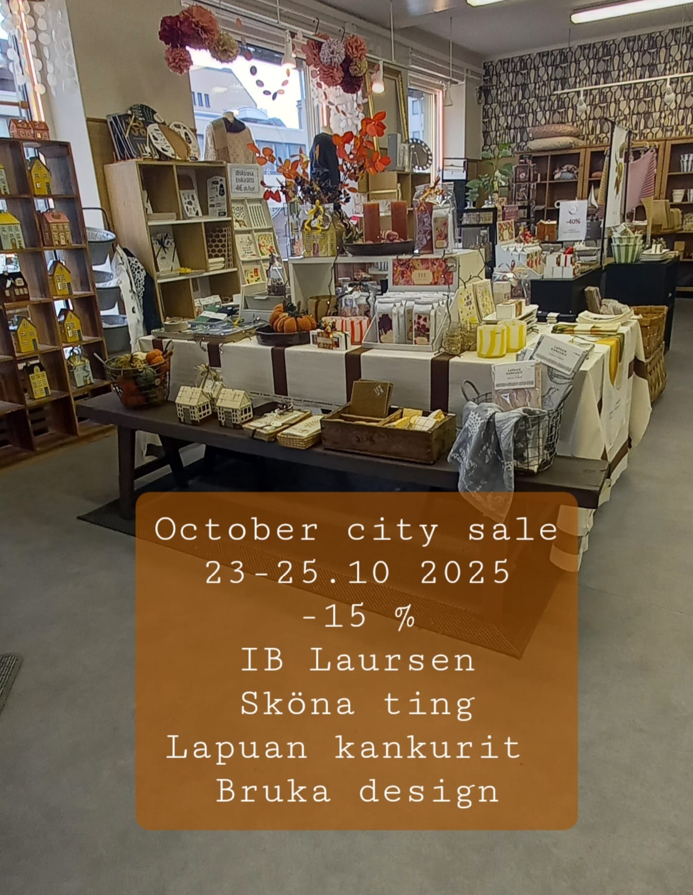 Osallistu meidän arvontaan. Kupongit löydät myymälöistä, jotka ovat mukana October City Sale tapahtumassa. Me arvomme kaksi 100€ arvoista lahjakorttia. Lahjakortin voit käyttää valitsemassasi jäsenmyymälöissä.